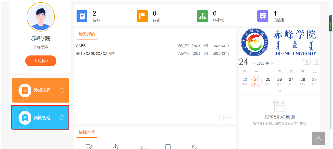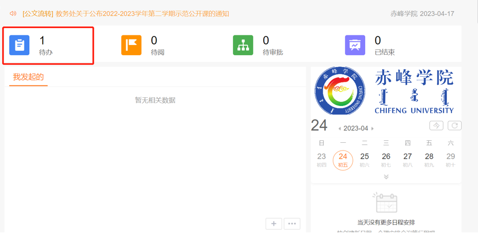 1、本部门负责人登录账号,点击首页待办按钮查看待办消息。
