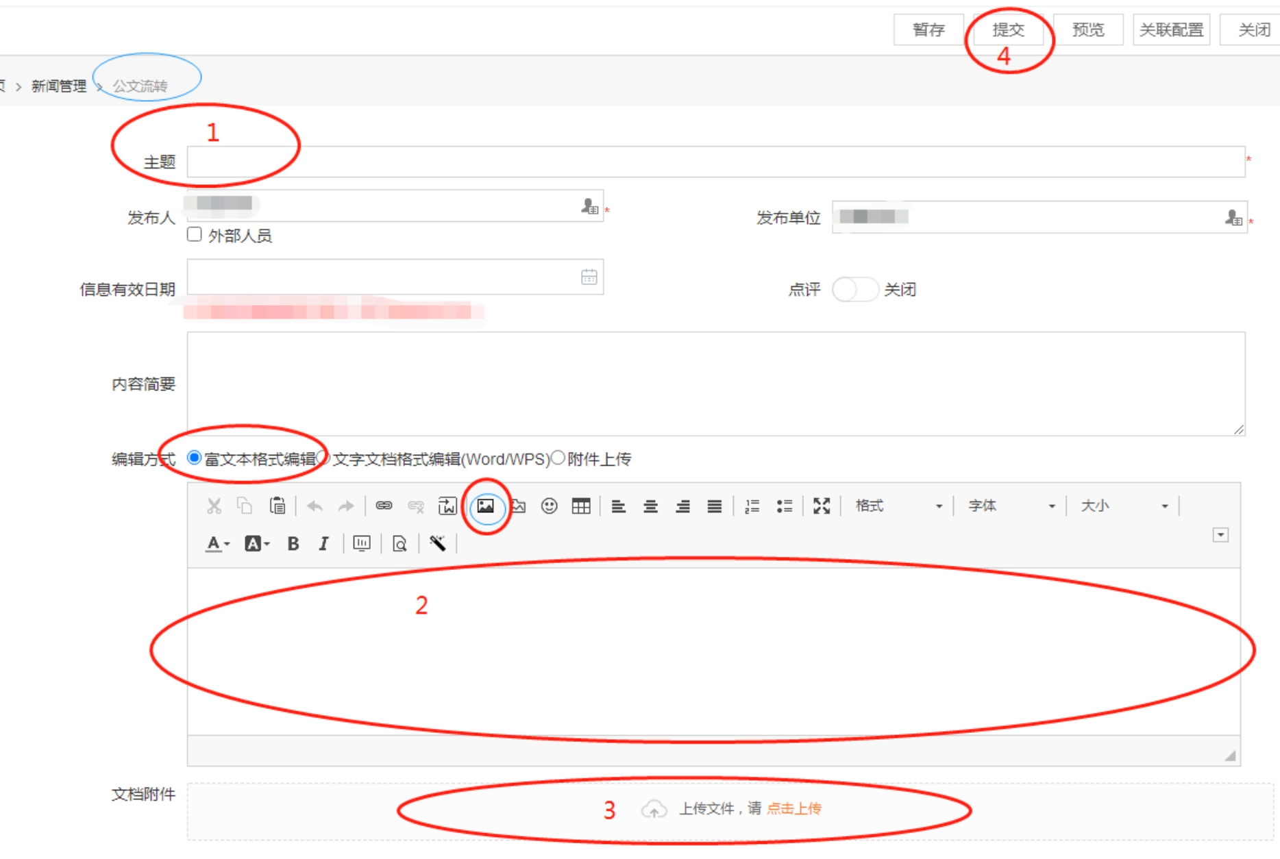在主题框内填写标题内容,内容简要为选填,正文编辑方式默认选择“富文本编辑格式”(请勿选择另两项),将在word或wps软件编辑完成的内容粘贴在下方的正文框中。