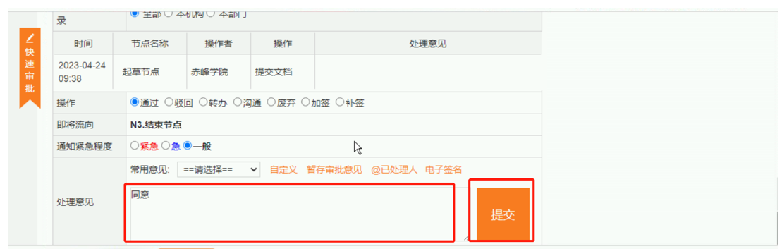 点击“提交”按钮完成公文审批。