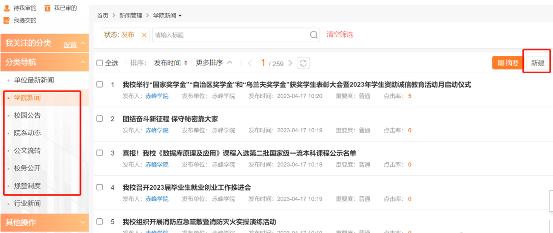 在界面左侧选择要发布的模板分类,选择进入对应栏目点右上角“新建”。