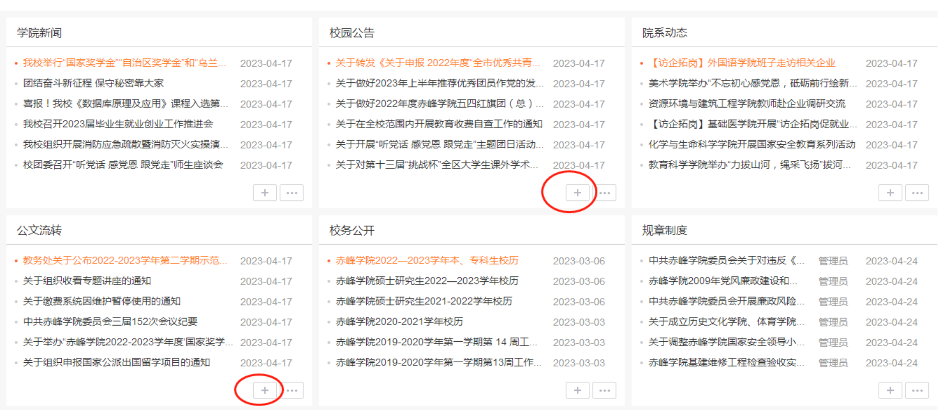 在新闻(信息)展示界面,点击每个模块下对应的“加号”按钮即可新建相应的新闻。