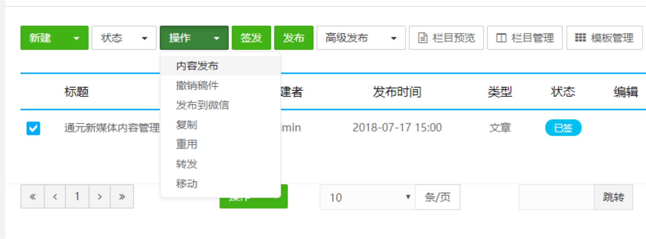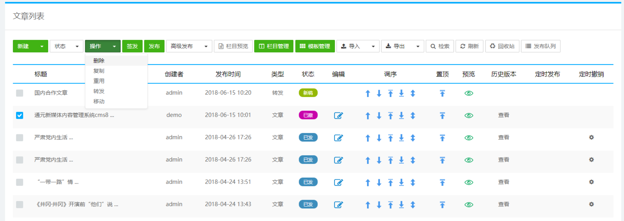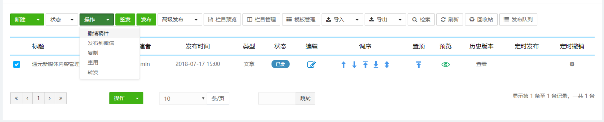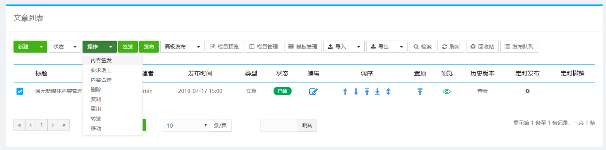 进入cms8后台,点击<功能区>的【内容管理】进入内容管理页面,选择任意栏目,可进行文章的录入、编辑、修改、签发、发布等操作。