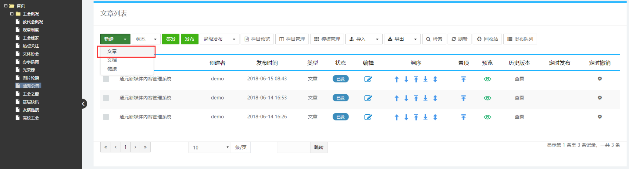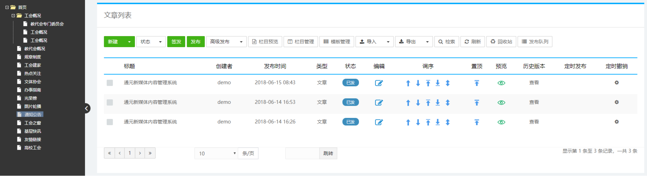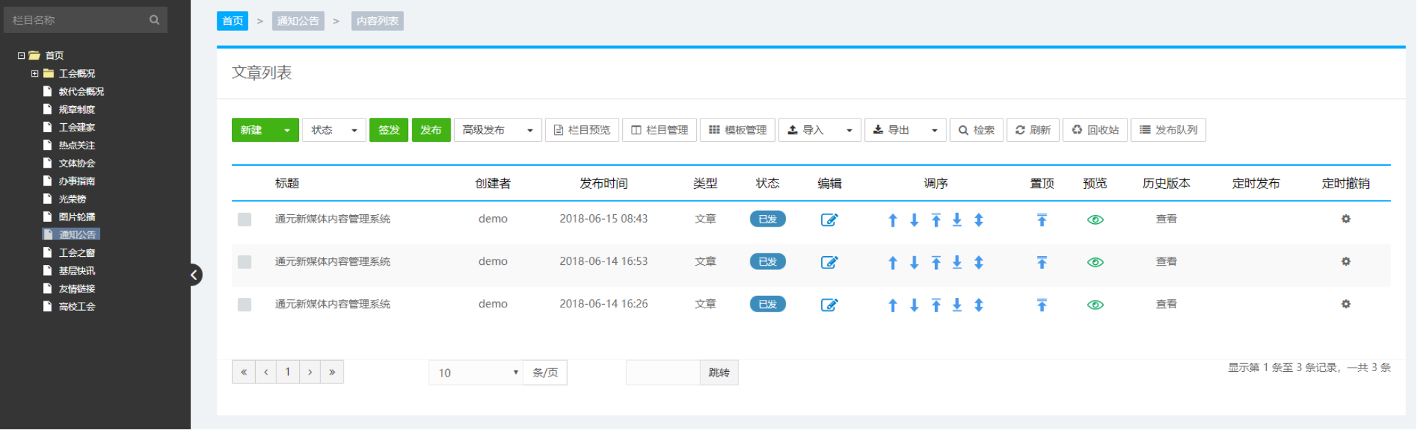 进入cms8后台,点击<功能区>的【内容管理】进入内容管理页面,选择任意栏目,可进行文章的录入、编辑、修改、签发、发布等操作。