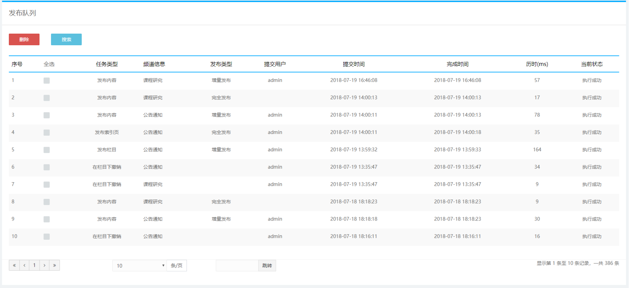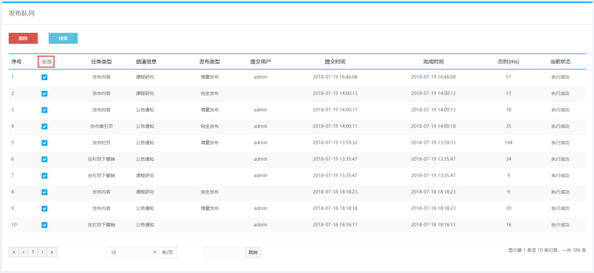 用户可以点击全选按钮选中列表文章,批量删除队列内容。