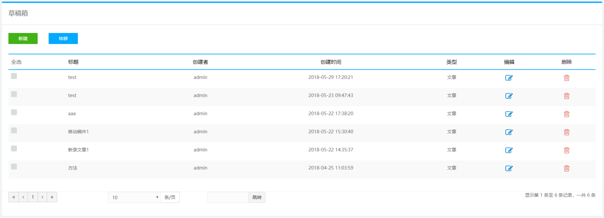 【草稿箱】的作用是新建或存放一些文章,可以修改,可以转移到站点的栏目,作为站点栏目下的文章。可以选择草稿箱里的多篇文章,转移到指定的站点下的栏目下,按取消则返回。