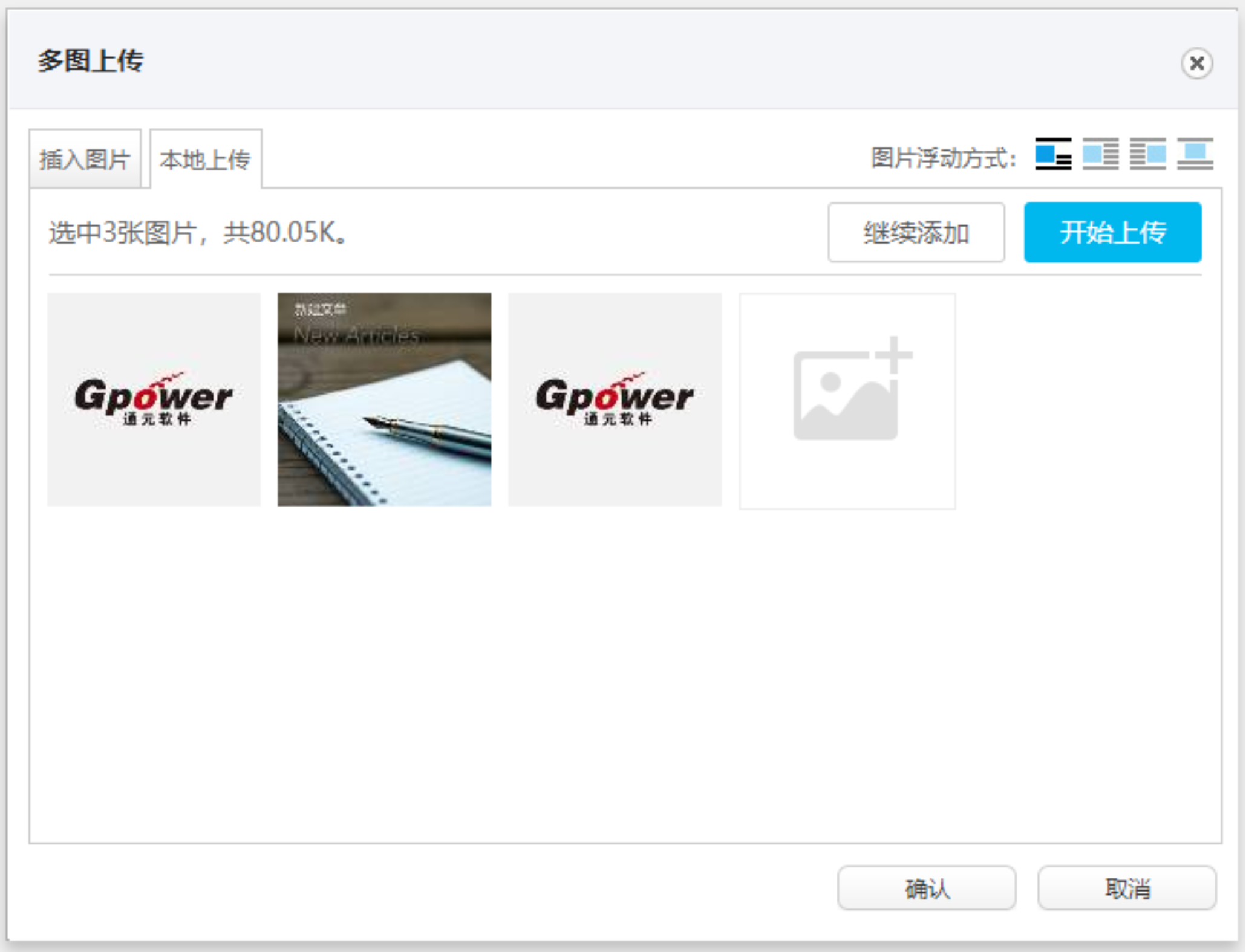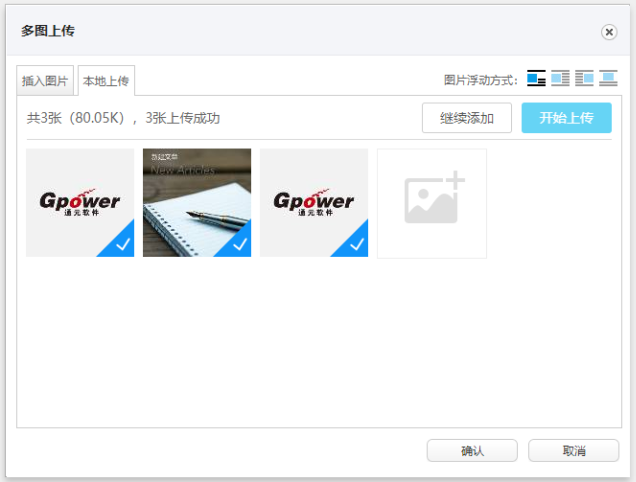 点击开始上传,图片上传成功。可以继续添加图片,也可直接确认,图片会自动显示在内容中。