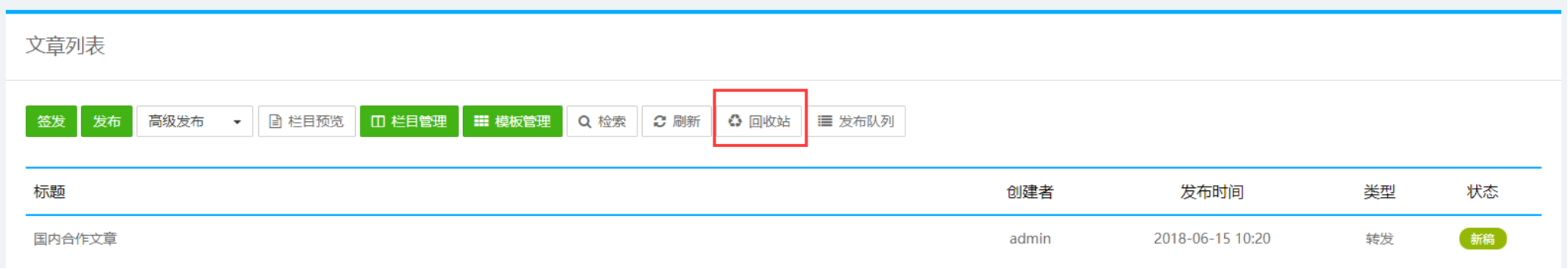 选择要删除的文章,点击操作按钮中的【删除】,删除后的文章可以在回收站中找到,点击对应文章列表中的 按钮,进入当前栏目对应的回收站: