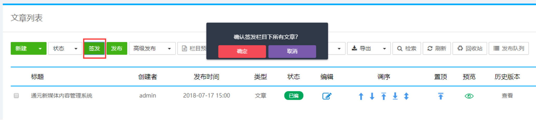 或者选择顶部的【签发】按钮,点击确定,可以对新稿、已编的文章进行批量签发: