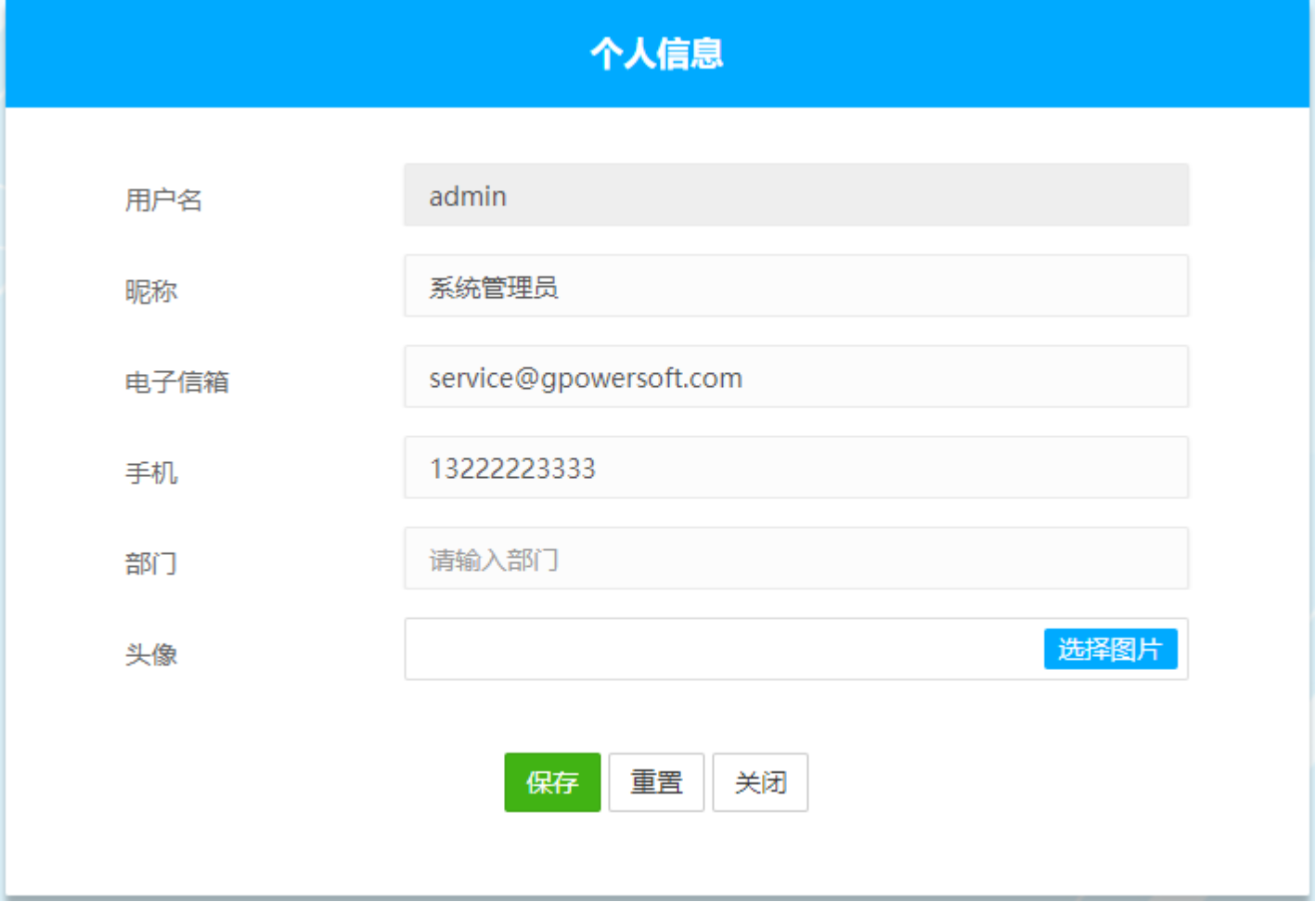 点击基本信息,用户可以修改昵称、电子信箱、手机、部门、头像等信息,用户名不允许修改。