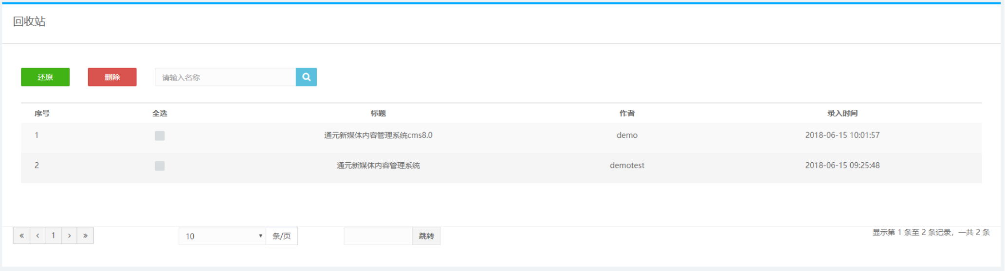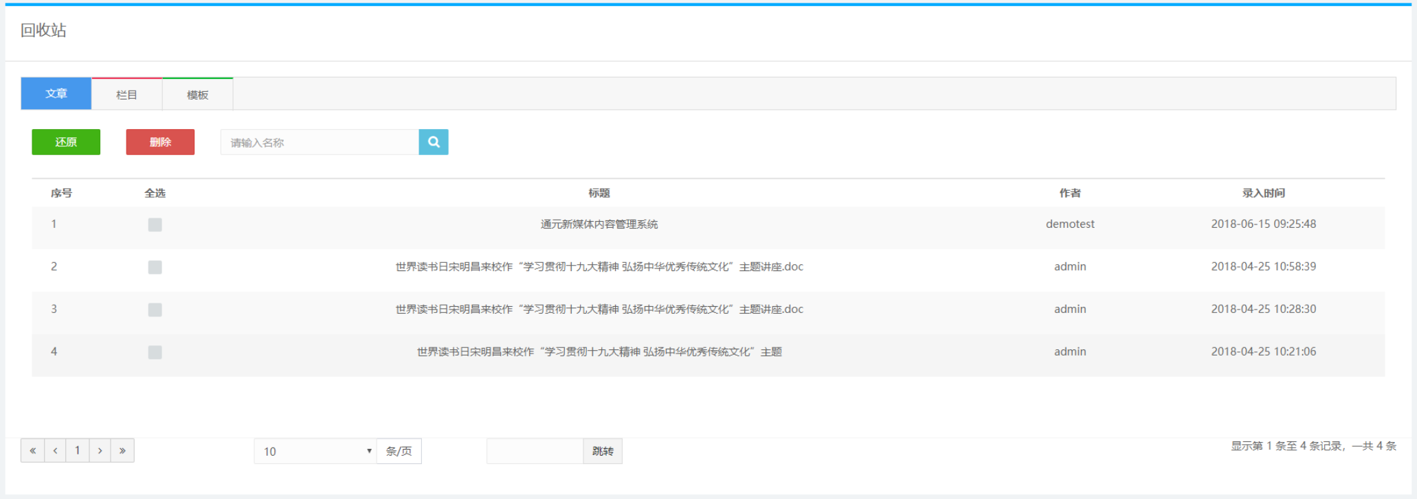 回收站会暂时存放用户删除的文章、栏目和模板,在回收站里用户可以进行文章、栏目、模板的还原,也可以从数据库中彻底的删除。