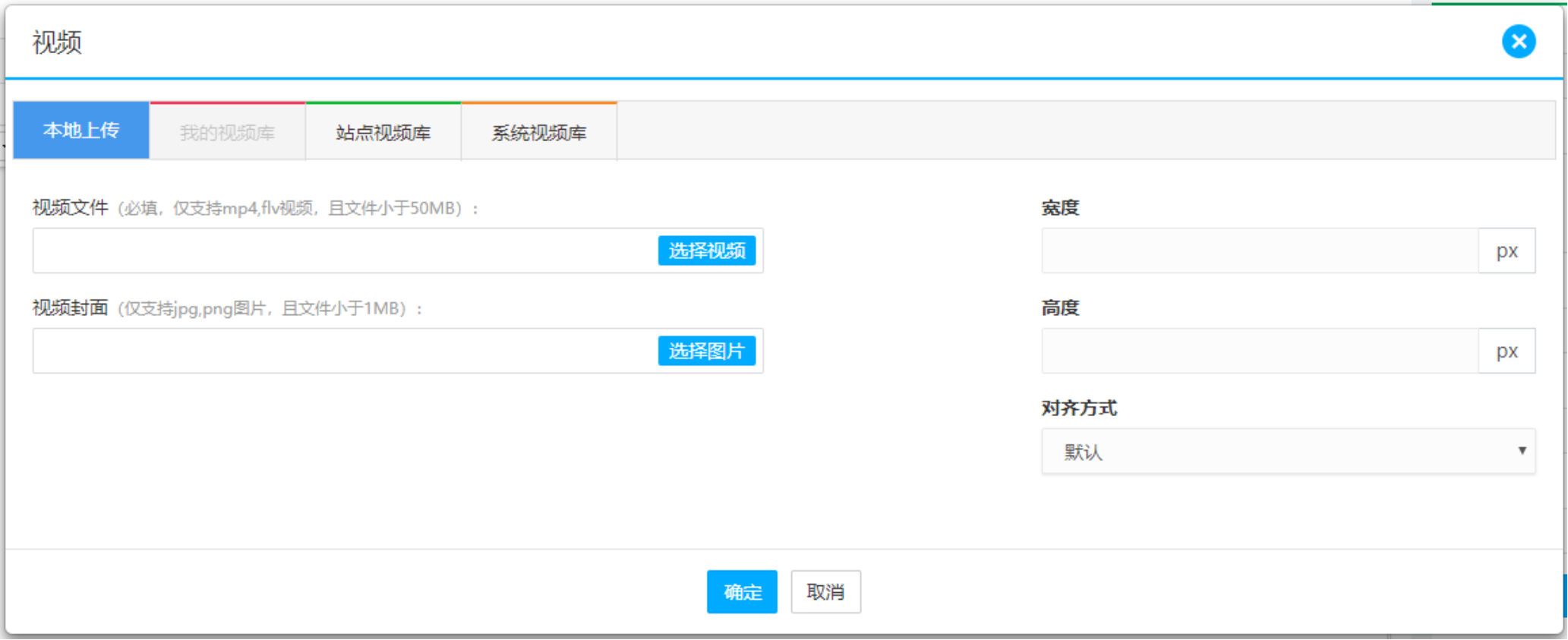 上传视频:用户可以在文章添加视频文件,视频支持MP4、flv格式,支持从本地上传、选择站点视频库或系统视频库中的视频。视频中可以设置视频封面,可以设置视频的大小。