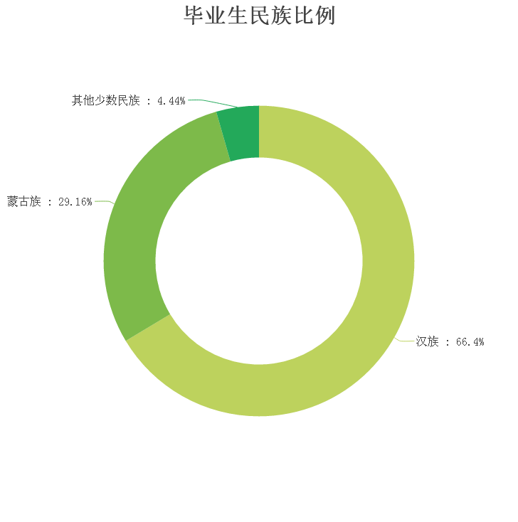 2017届毕业生中,汉族毕业生1972人,占毕业生总数的66.40%;蒙古族毕业生866人,占毕业生总数的29.16%;其他少数民族毕业生132人,占毕业生总数的4.44%。