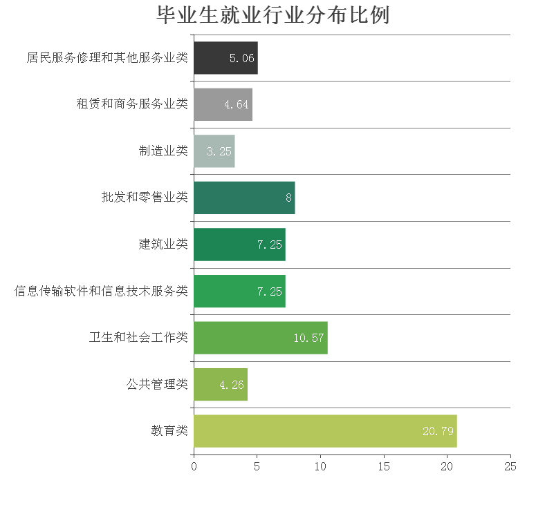 (3)按单位行业划分,接收我校毕业生较多的行业主要有教育类,就业551人,占已就业人数的20.79%;公共管理、社会保障和社会组织类,就业113人,占已就业人数的4.26%;卫生和社会工作类,就业280人,占已就业人数的10.57%;信息传输、软件和信息技术服务业类,就业192人,占已就业人数的 7.25%;建筑业类,就业192人,占已就业人数的 7.25%;居民服务、修理和其他服务业类,就业134人,占已就业人数的 5.06%;批发和零售业类,就业212人,占已就业人数的 8.00%;制造业类,就业86人,占已就业人数的 3.25%;租赁和商务服务业类,就业123人,占已就业人数的 4.64%。具体分布情况见图2-4。